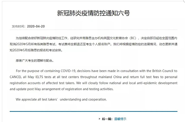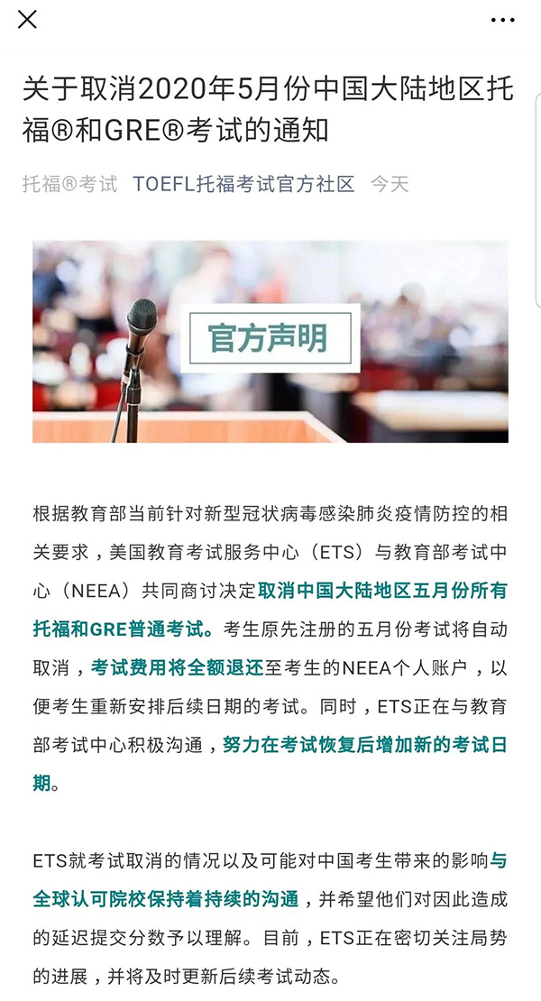 官宣,雅思托福在刚刚发布通知,取消五月国内考试。