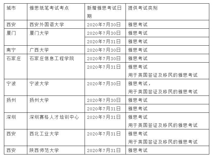 接英国文化教育协会通知,为满足广大考生的考试需求,英国文化教育协会在恢复雅思(IELTS)和用于英国签证及移民的雅思(IELTS for UKVI)纸笔考试的部分考点,新增以下2020年7月30日和31日的纸笔考试场次,并于即日起开放报名,请尽快登录教育部考试中心雅思报名网站https://ielts.neea.cn/查询最新考位信息。