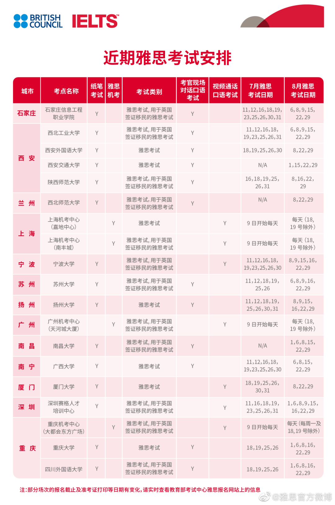 雅思官方又新增3大考点:西安交通大学(西安)、西北师范大学(兰州)、南昌大学(南昌)!考试时间均在8月,8月的考生可以安排起来啦~