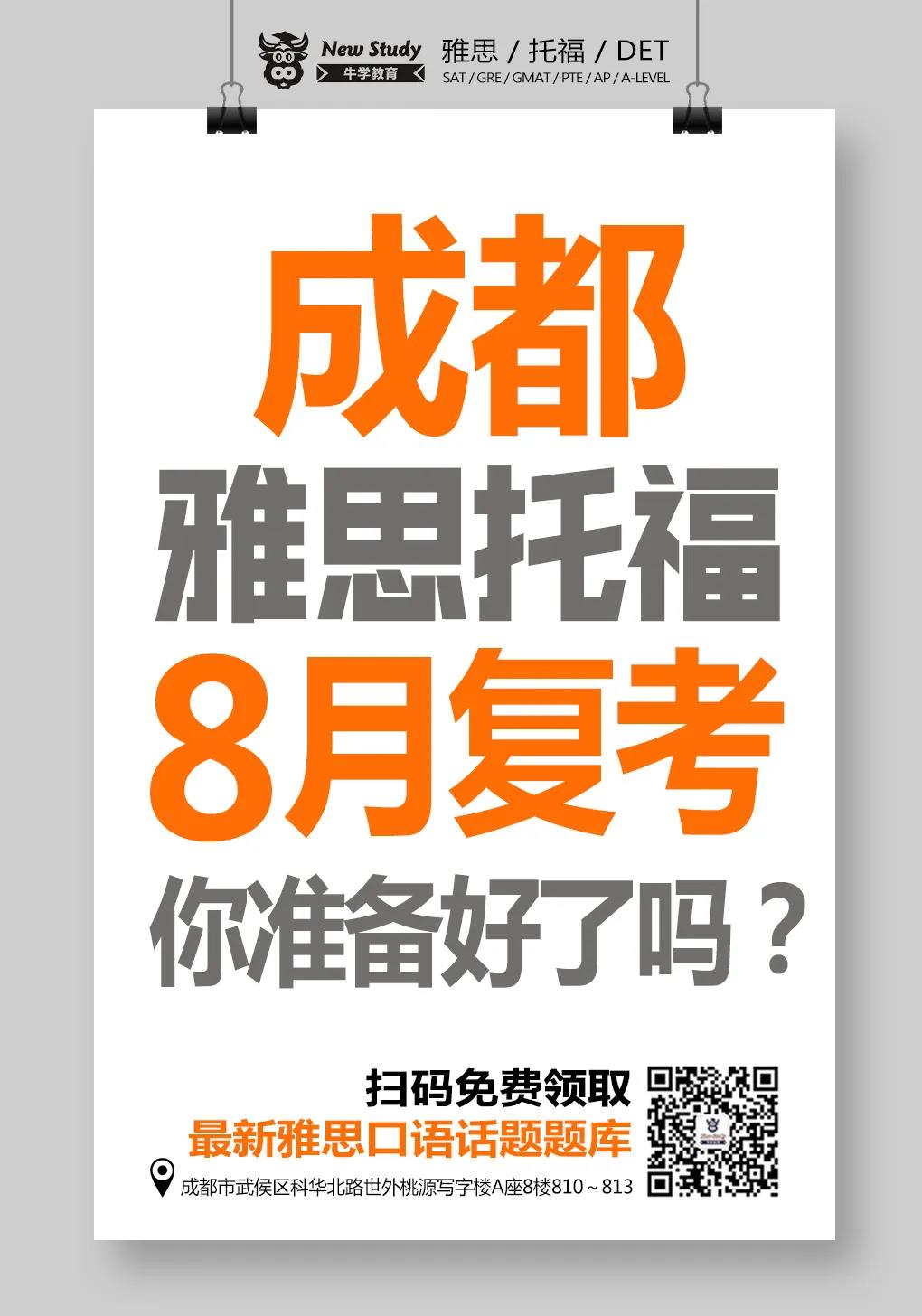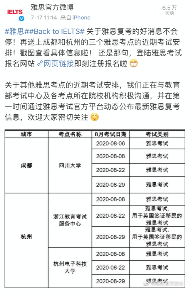 今早,雅思官方发布了成都,杭州复考安排
