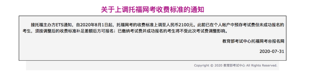 7月31日,托福官网终于放出针对大陆地区的具体金额。自2020年8月1日0时起,考生须按调整后的金额支付考试费。托福网考报名费上涨至2100元。此前已在个人账户中预存考试费但未成功报名的考生,须按调整后的收费标准补足差额后方可报名;已缴纳考试费并成功报名的考生将不受此次考试费调整影响!