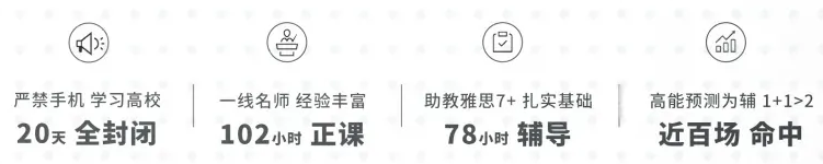 20天封闭集训,完整的听说读写课程培训体系。一线名师,每五位同学分配一名雅思7.0+助教,监督学习,练习口语,听写单词。全封闭模式,避免干扰,高效学习,预测为辅,技巧为王,实现1+1>2!