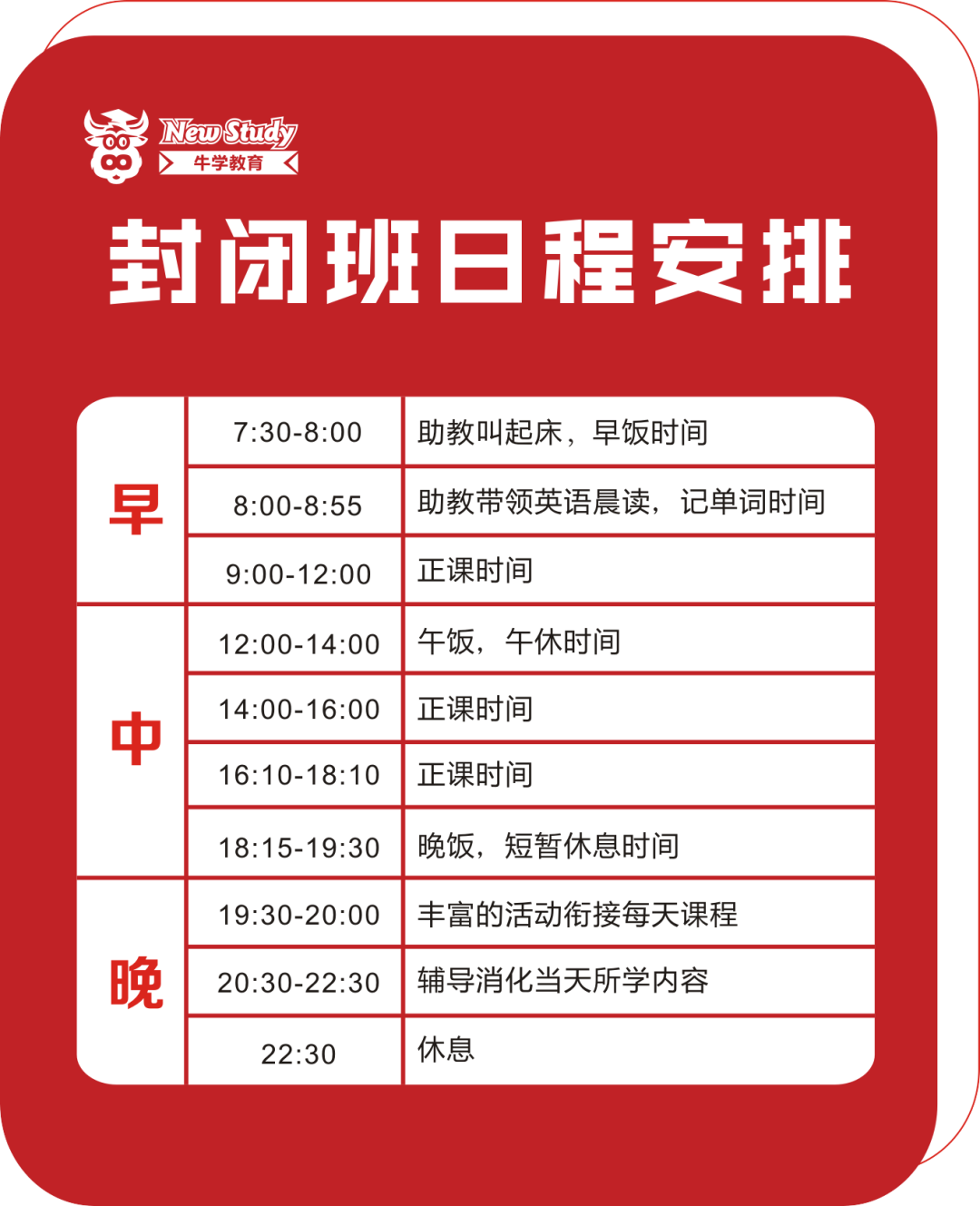 一个人如果不逼自己一把,永远都不知道自己有多优秀,23天提分,你也可以!牛学封闭班的每一天,都从早上7:30开始 晚上22:30结束,吃饭、晨读、上课、辅导均在学院的安排的下有序进行!让时间合理运用,知识有效吸收。