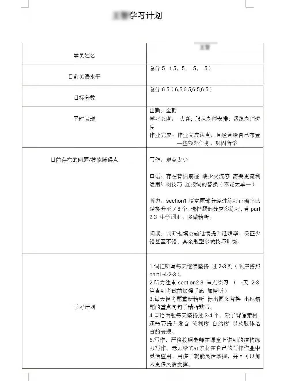 一对一制定学习计划,针对学员自身特点,从听、说、读、写各项,制定短期高效提分方案,拔高短板,精准提分!
